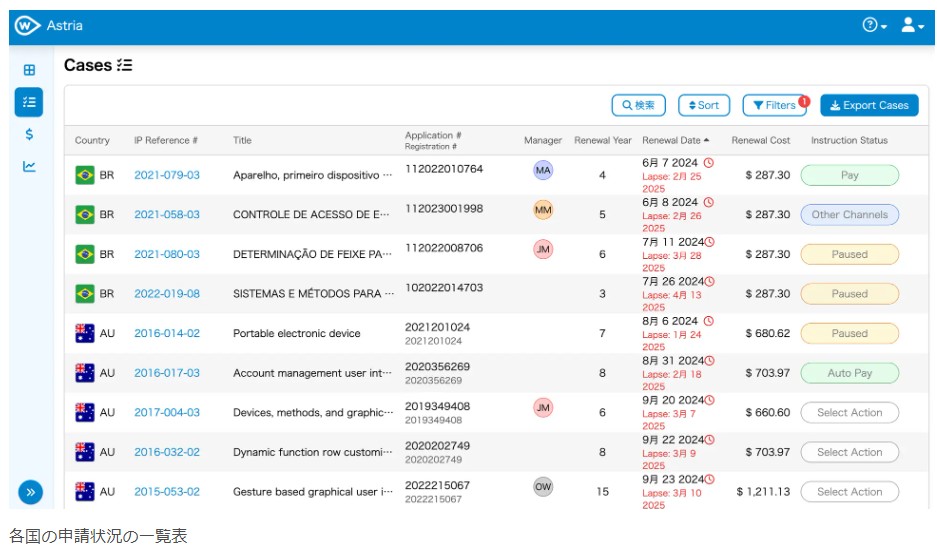 特許を国別・ファミリー別・担当者別に一覧表示し、状況を一目で把握可能。支払いステータスを更新するだけで特許庁への支払いが自動完了し、自動更新設定にも対応。特許管理の手間を軽減。